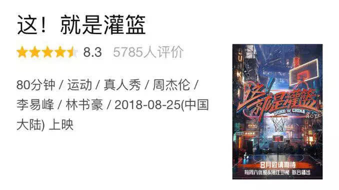 《這!就是灌籃》的賣點是籃球比賽,再加上非常豪華的導師陣容,周杰倫李易峰,此外還有職業籃球運動員郭艾倫林書豪(可能不看籃球比賽的妹子幾乎沒聽過這兩人)。節目定位相比之下偏小眾了點,但是這部綜藝卻默默地在豆瓣上拿下高分8.3分。