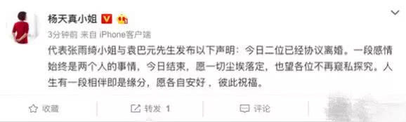 9月27日傍晚,張雨綺的經(jīng)紀人發(fā)微博宣布,張雨綺和老公袁巴元已經(jīng)協(xié)議離婚。這個消息一傳出,網(wǎng)絡上瞬間炸鍋了。