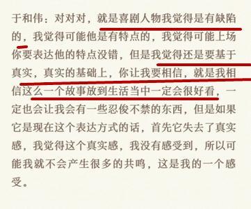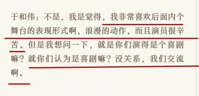 當第一組嘉賓楊迪、張含韻、曹炳琨、王茂蕾表演結束后,于和偉態度真誠,直言喜歡后面的演員的處理方式,并詢問到,這是一個喜劇嗎?而這個詢問被網友過度解讀,稱其是持有質疑態度,而從網友所放的完整版點評來看,這就是一個平等交流。