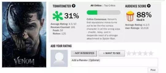 我們看爛番茄上的新鮮度只有31%,也就是說只有三分之一的人打滿分,參與評(píng)分的181家專業(yè)媒體,只有56家給了新鮮,125家給了爛番茄。